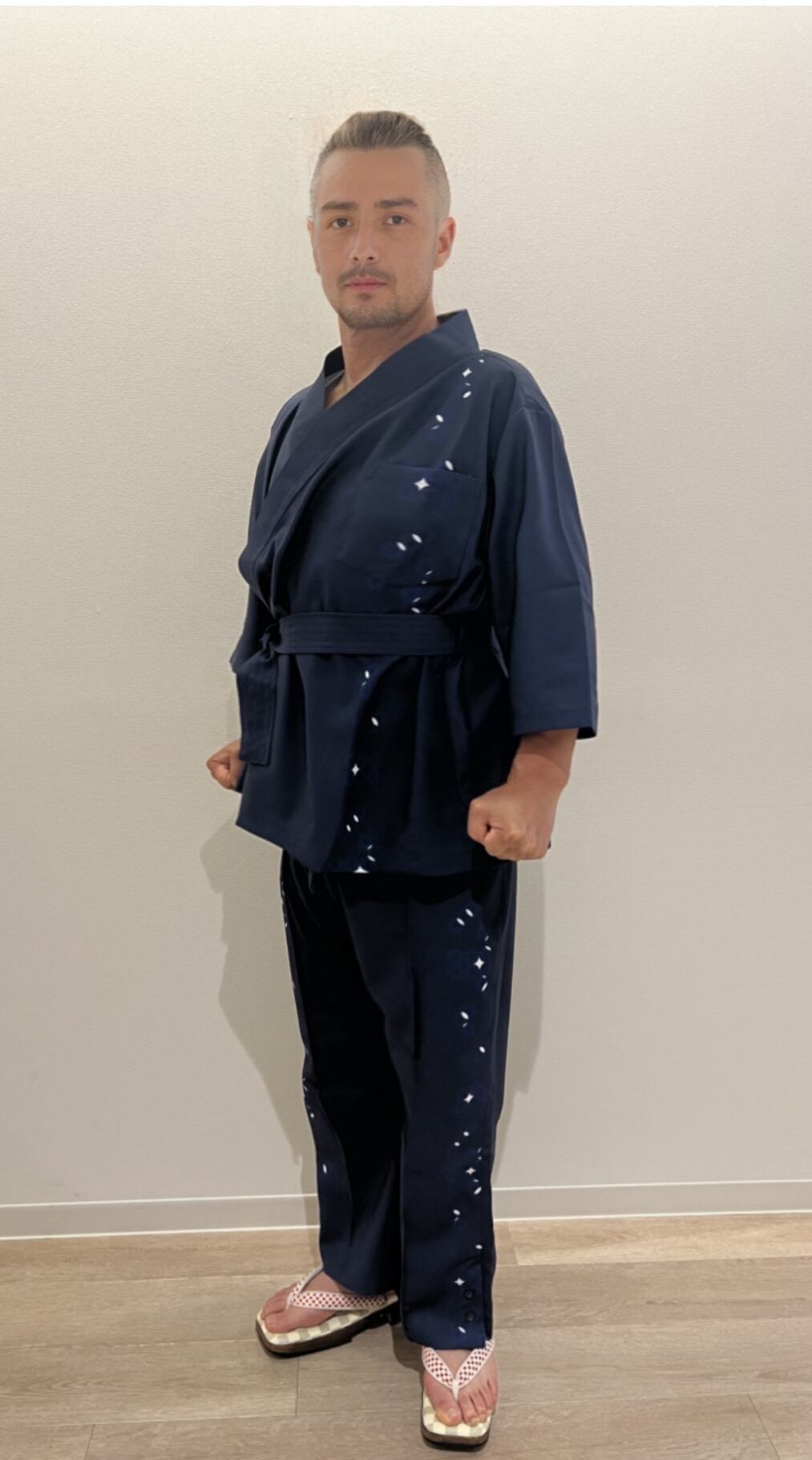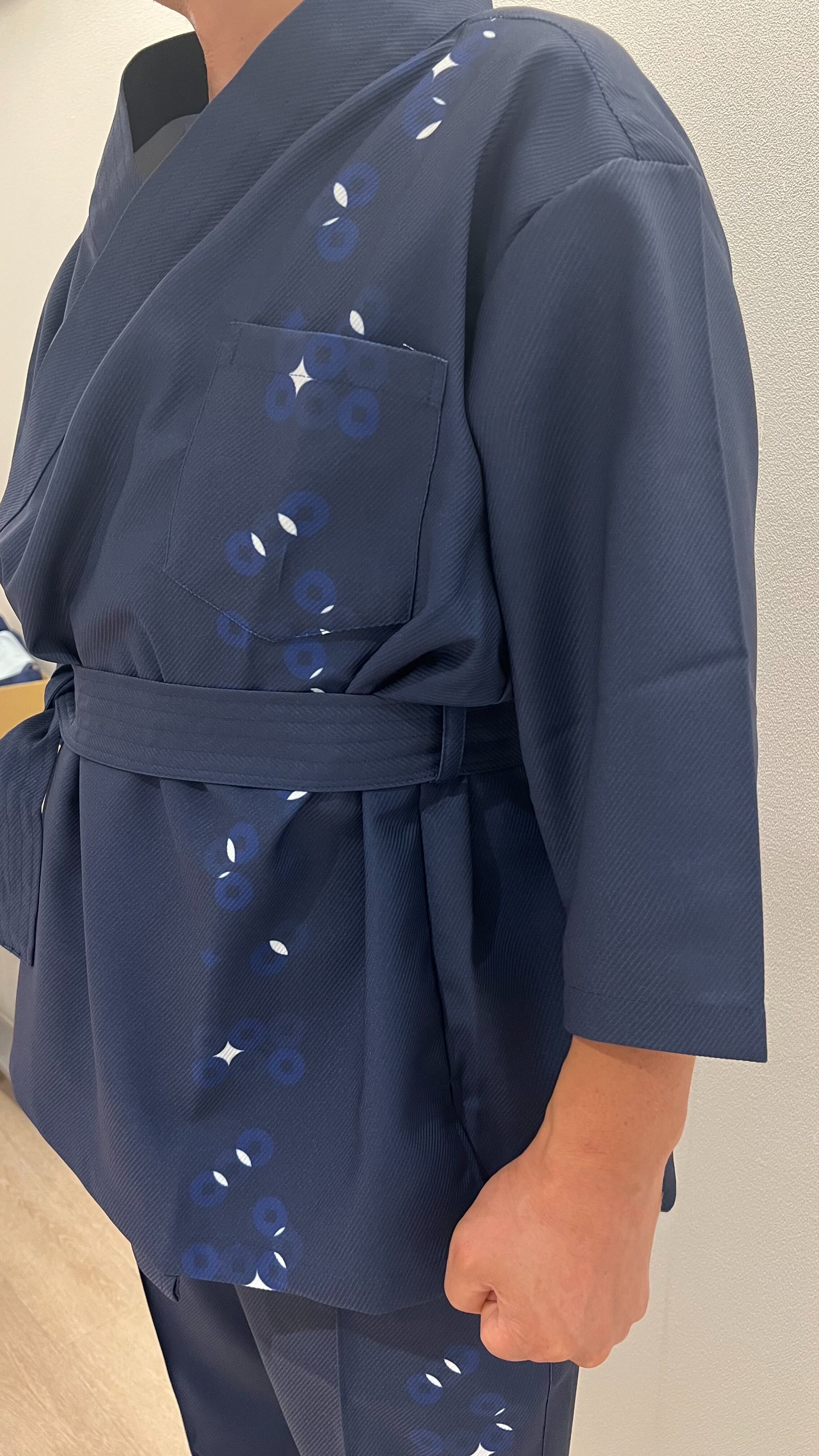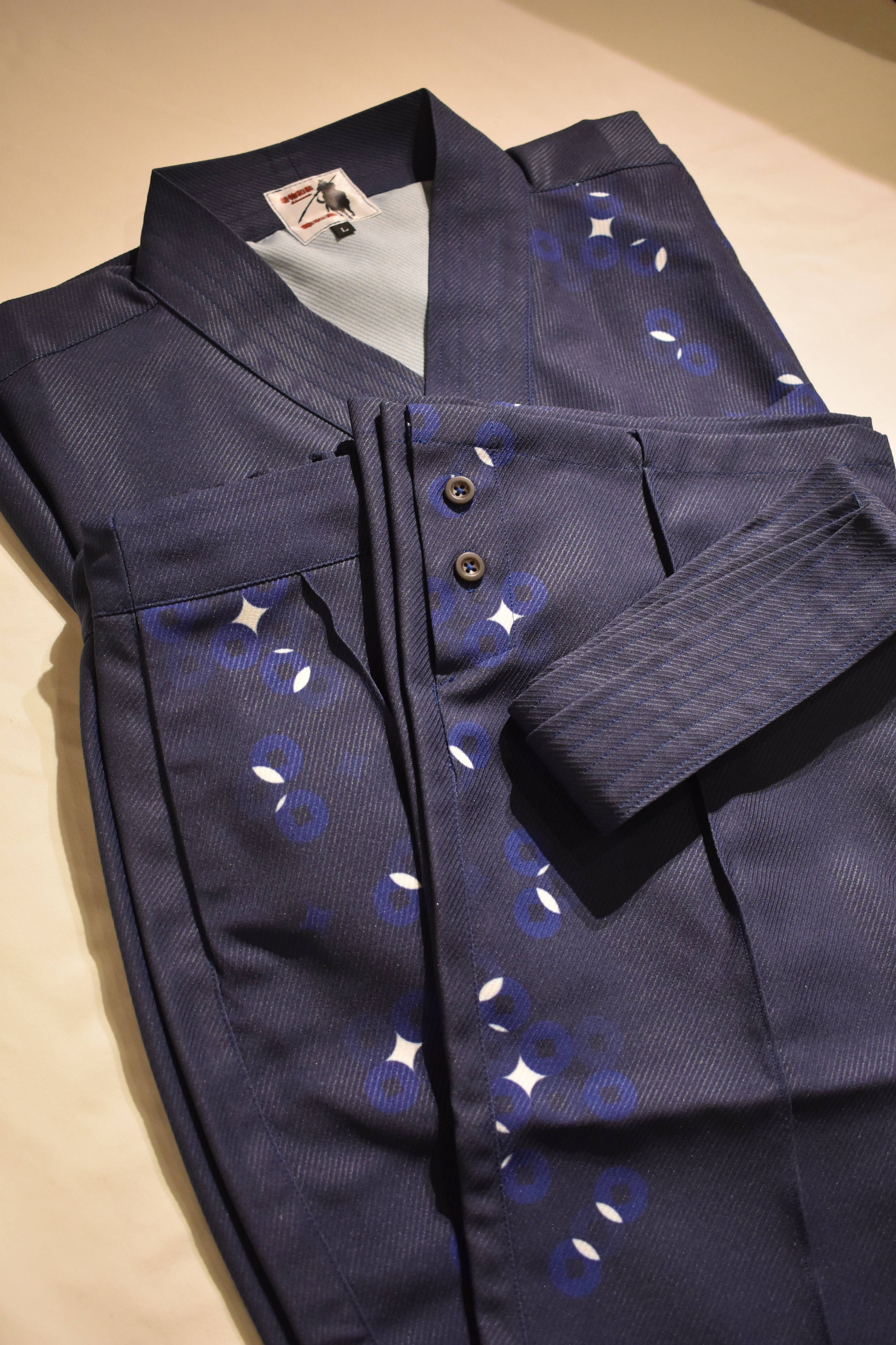 24時間着物を着る。着苦しくない簡単。そして世界初JAPAN beauty着物と日本の国技柔道、空手の道着を融合。オシャレ感とシルエットを大切に更に柄は昔からの人々の念いや考え方がある小紋柄に拘り本格着物調に。素材はまさに空手の聖地琉球のかりゆしの最高綾織ポリエステルで