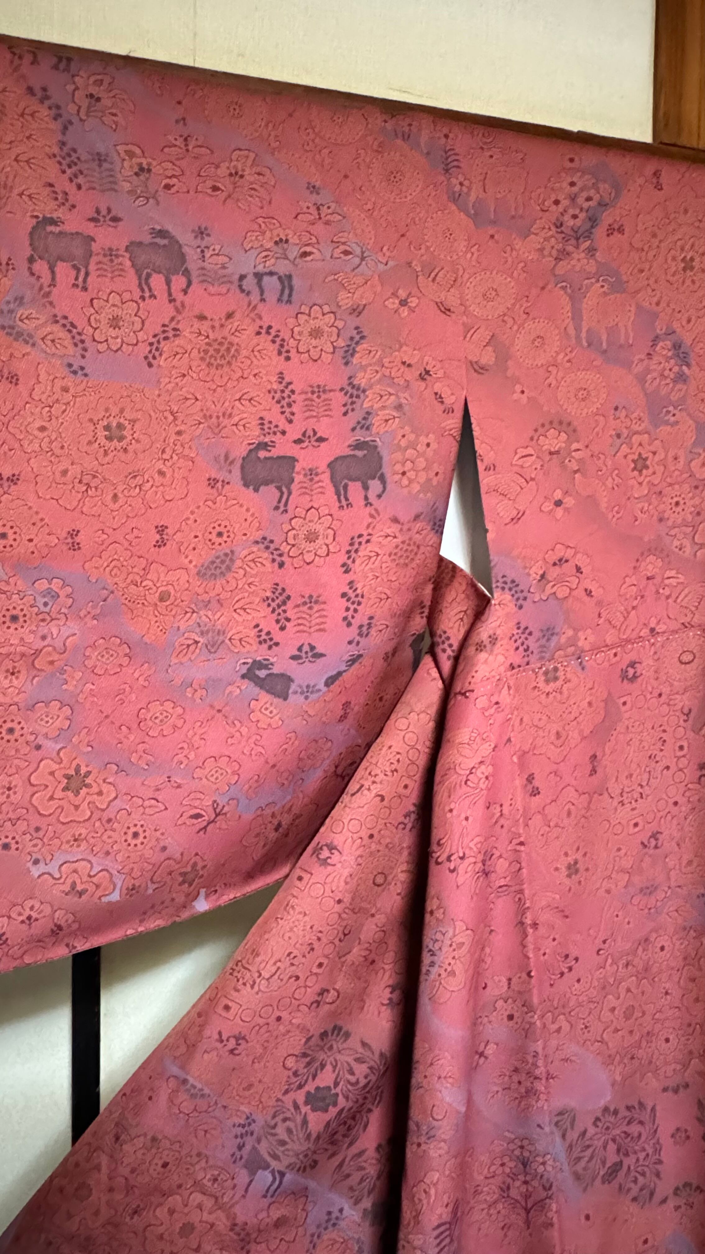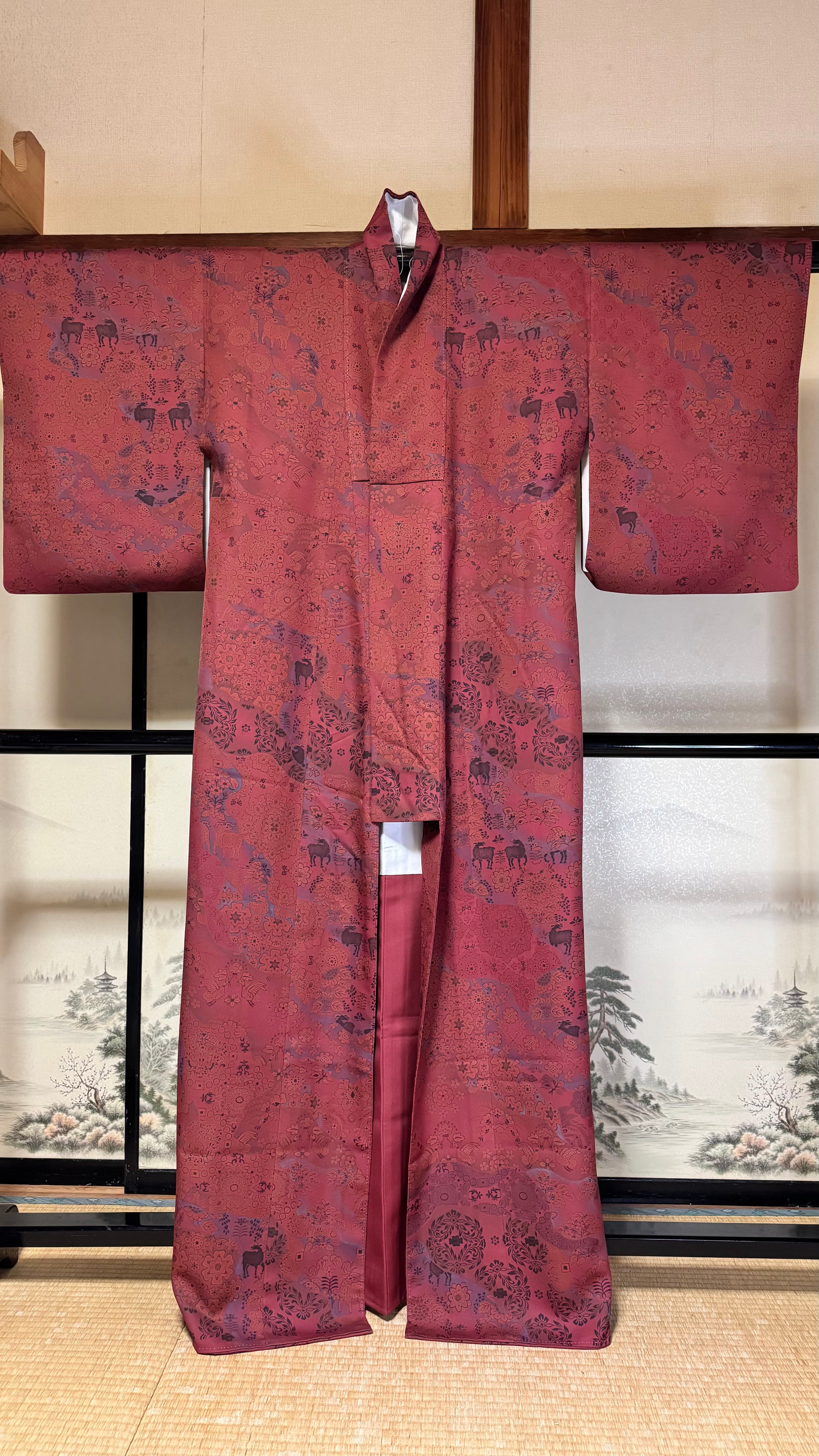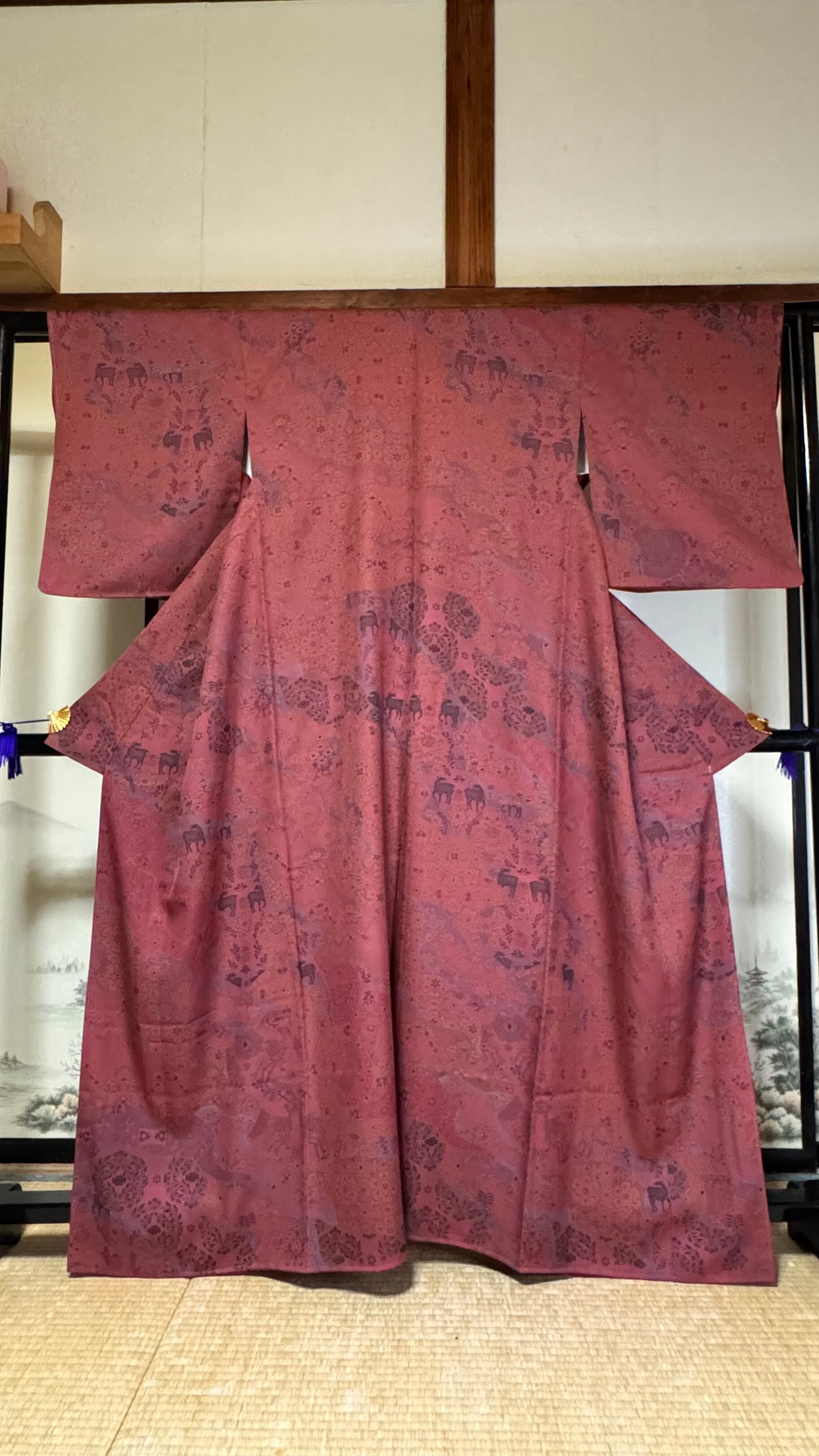 この可愛い小紋は、エンジ色に動物柄が施された特別な一着です。遊び心溢れるデザインは着物を身近に感じさせ、日常のコーディネートを華やかに演出してくれます。サイズ感もぴったりで、コーディネートの幅を広げるアイテムとして大活躍間違いなしです。