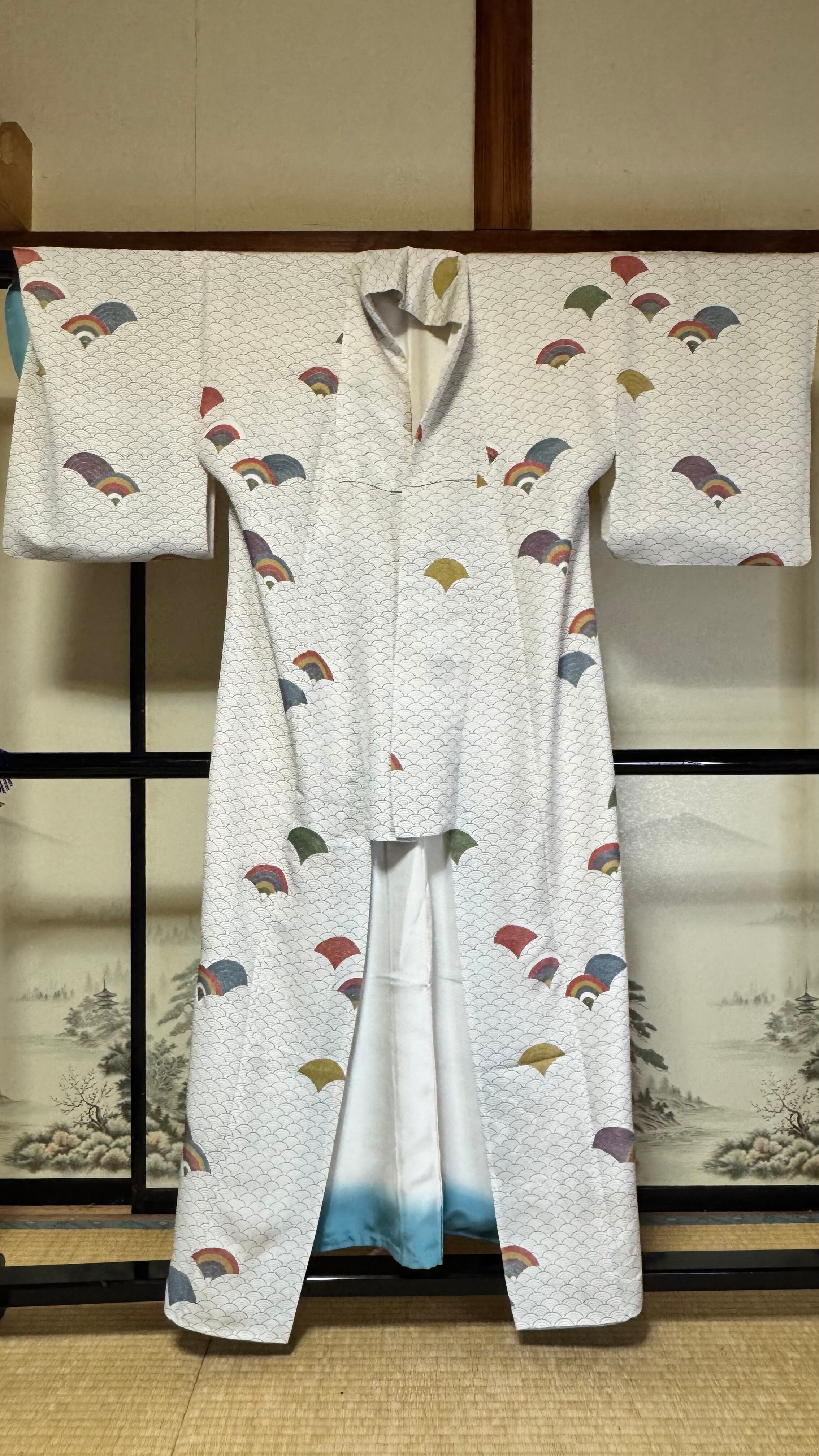 この小紋は、白と青の美しいコントラストが特徴で、青海波文様が高級感を演出します。清涼感あふれるデザインは、食事や街歩き、デートなど、さまざまなシーンであなたの魅力を引き立てます。シンプルながらも存在感があり、幅広いコーディネートに合わせやすい逸品です。